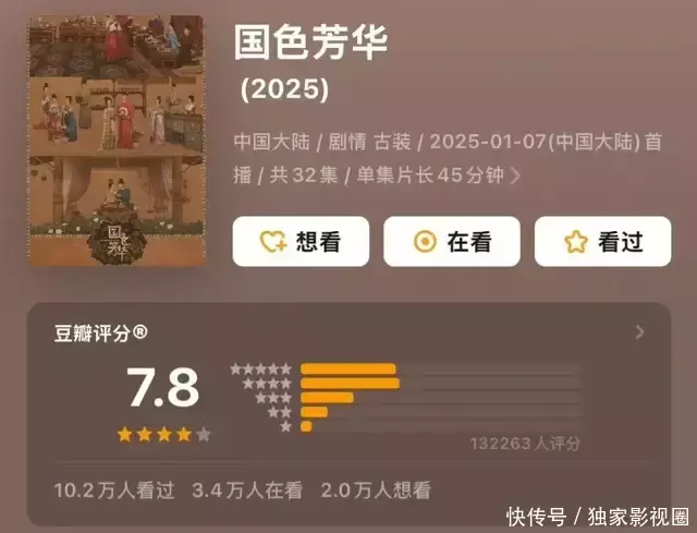 像《国色芳华》大家对它的预期开分普遍认为在8.0以上,毕竟《国色芳华》热播时不仅仅数据收视率抗打,而且截至现在,《国色芳华》上星依旧排在卫视榜top1。