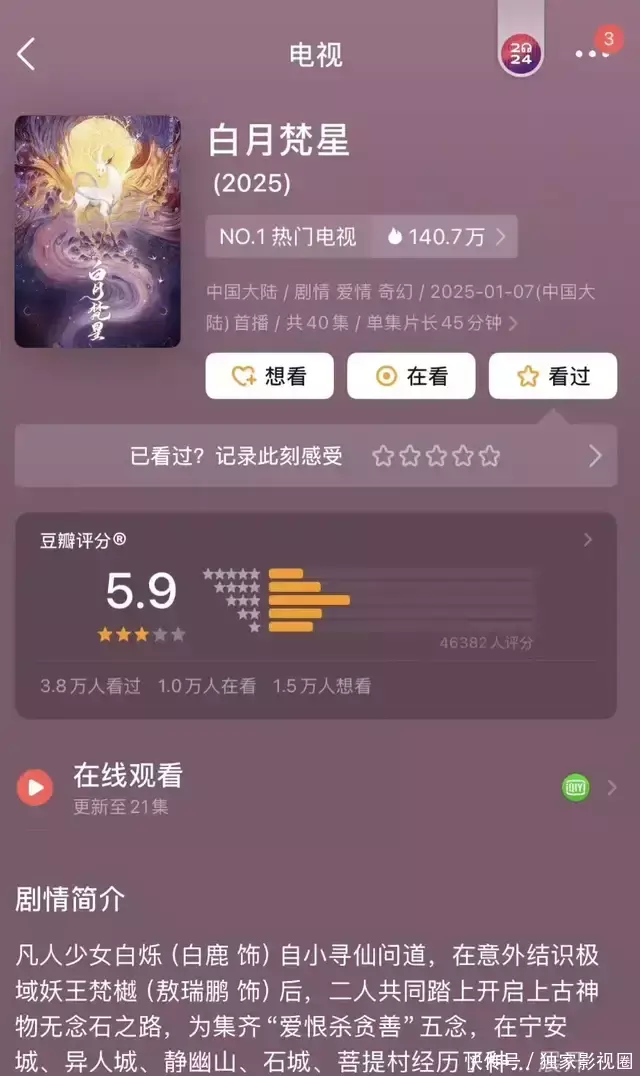 《白月梵星》和《国色芳华》对打,两部剧热度都很高,豆瓣分值却开分低,也恰恰说明古偶赛道不论是古装还是仙侠都挺卷的!白鹿杨紫的抗剧能力毋庸置疑,只是古偶赛道的剧本还需打磨,不仅仅演员演技要进步,导演编剧更应该与时俱进!
